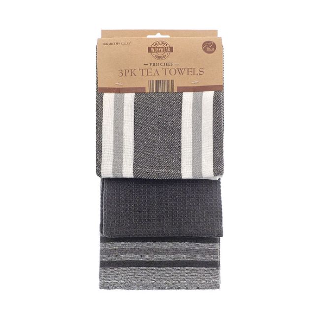 Pack of 3 eco-friendly Tea Towels in a contemporary colour and design. These tea towels are the perfect choice for an array of uses. Machine washable. 80% cotton / 20% polyester. Size: L60 x W45cm approx. Pack of 3.